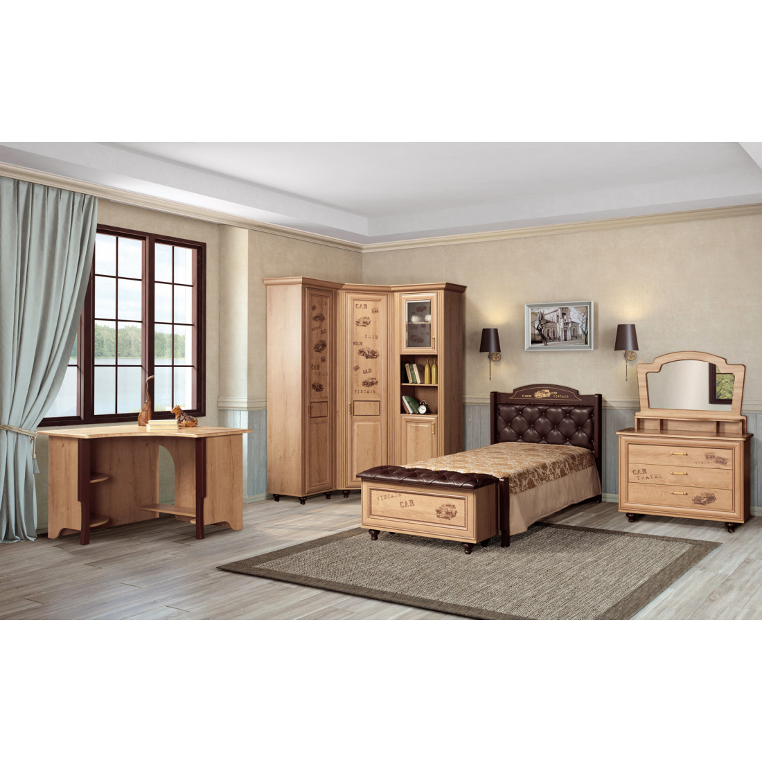 Корпус: ДСП, декор – дуб ридинг. Основание кровати – ламели