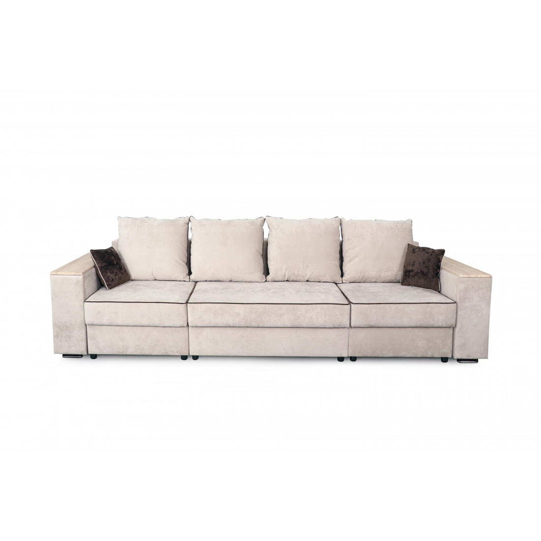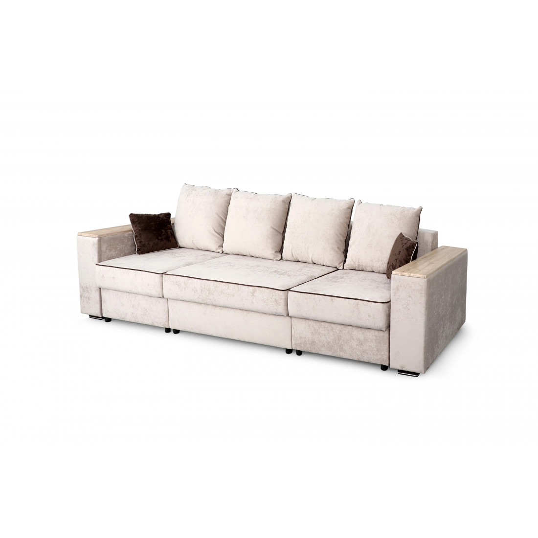 С одной стороны расположена боковина с нишей, с другой – ящики. Надежные петли с доводчиками добавляют комфортности использования мебели. Диван-трансформер может быть прямым, угловым и П-образным. Малые декоративные подушки входят в комплект дивана.