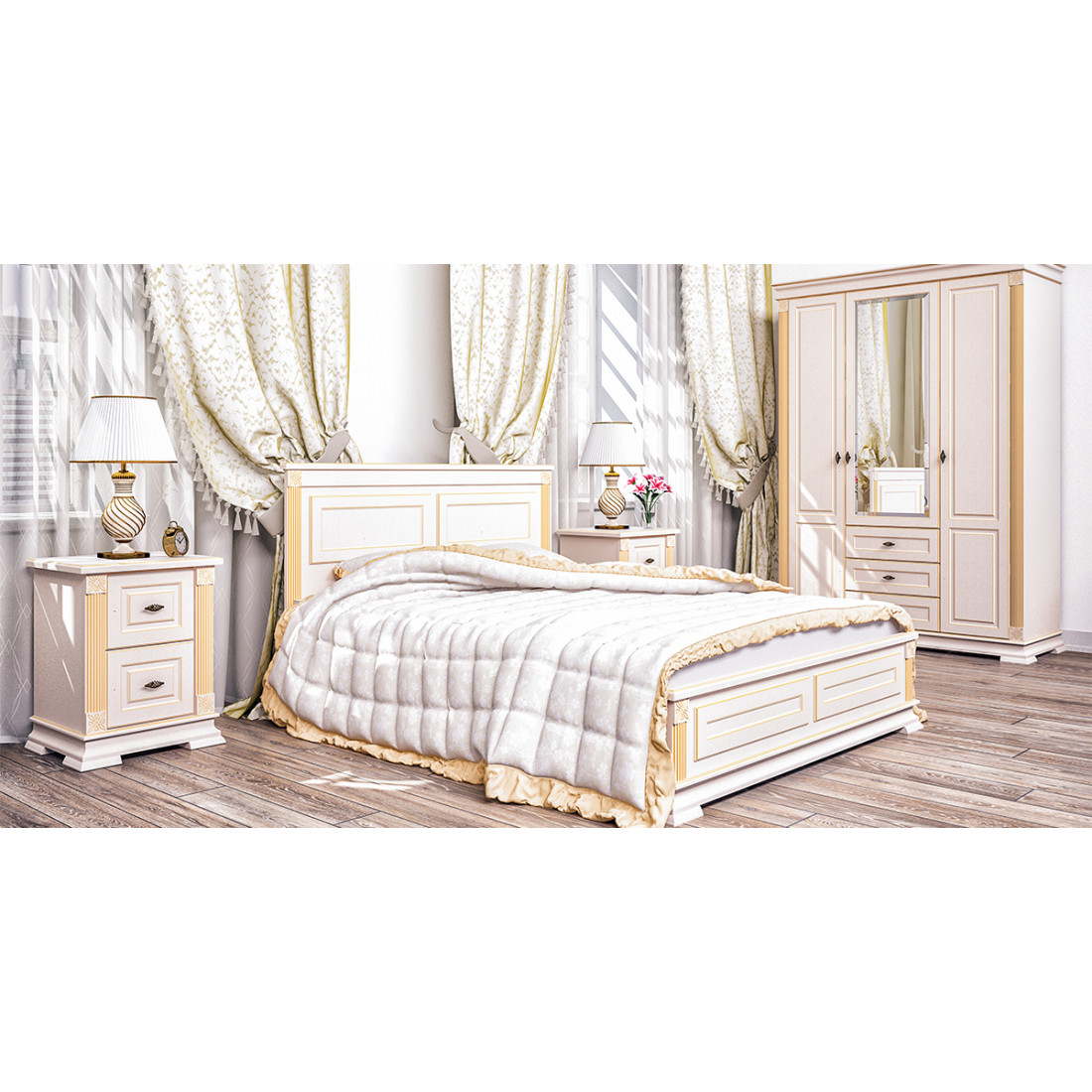 Двуспальная кровать МН-222-12 новой серии Афина от Мебель-Неман выполнена в цвете крем с золотой патиной.