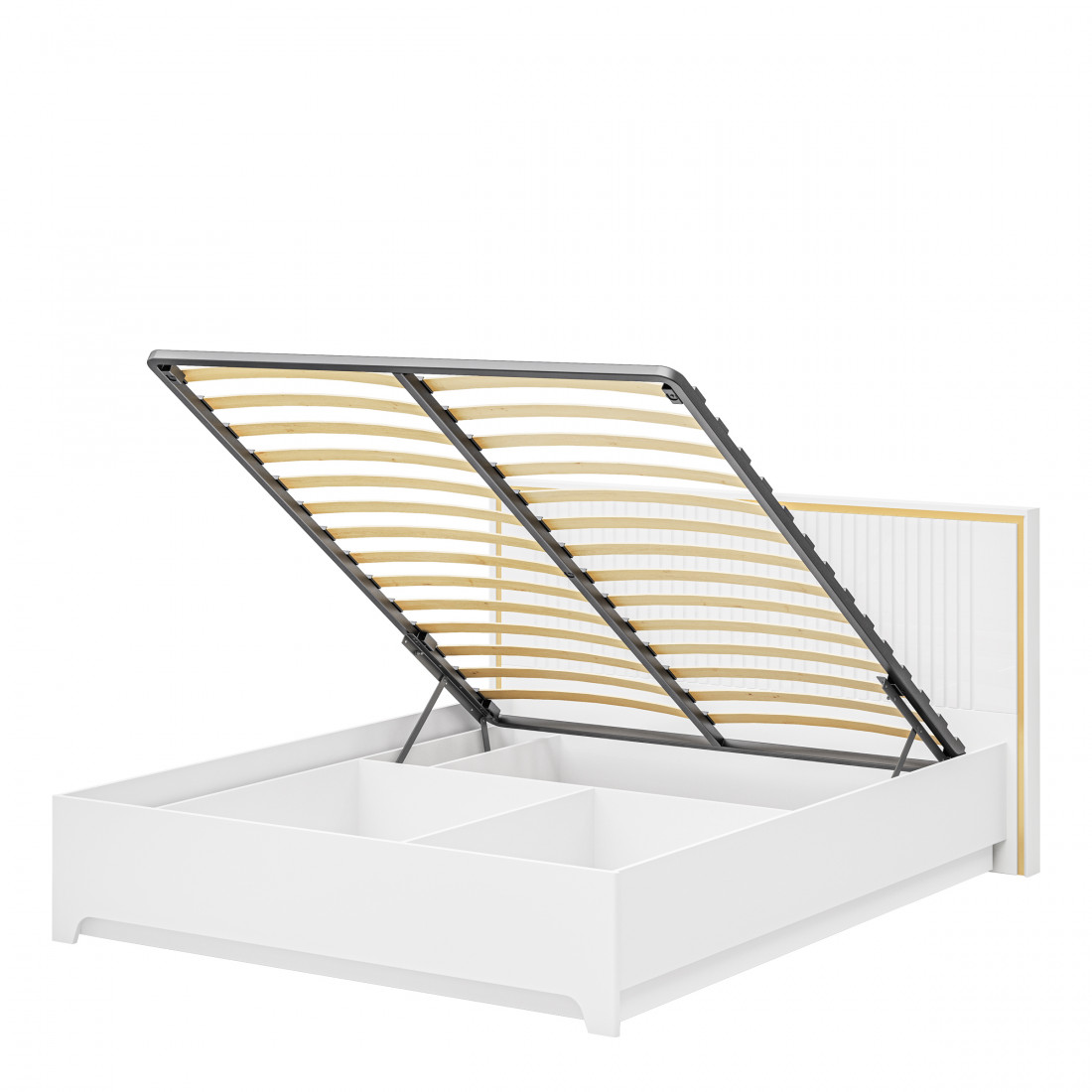 Белоснежная кровать из МДФ в цвете белый глянец. Изголовье кровати  украшено золотистой  каймой и рефленной фрезеровкой.