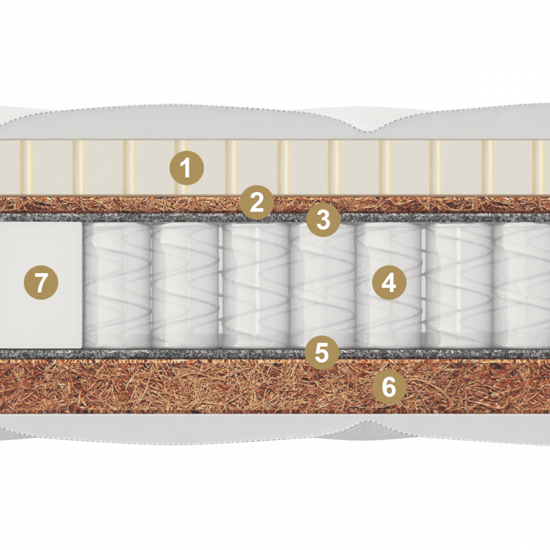 Двусторонний матрас с разными сторонами жесткости. С одной стороны более плотный кокос 100-ой плотности, с другой натуральный латекс с одним сантиметром латексированного кокоса. Обе стороны прекрасно подходят для формирования правильной осанки и здорового сна ребенка. Независимый пружинный блок в основе матраса будет надежной основой, которая поможет ощутить весь комфорт пружинного матраса.