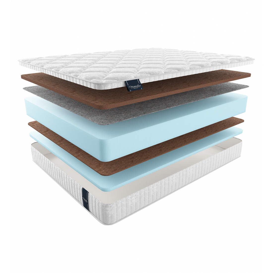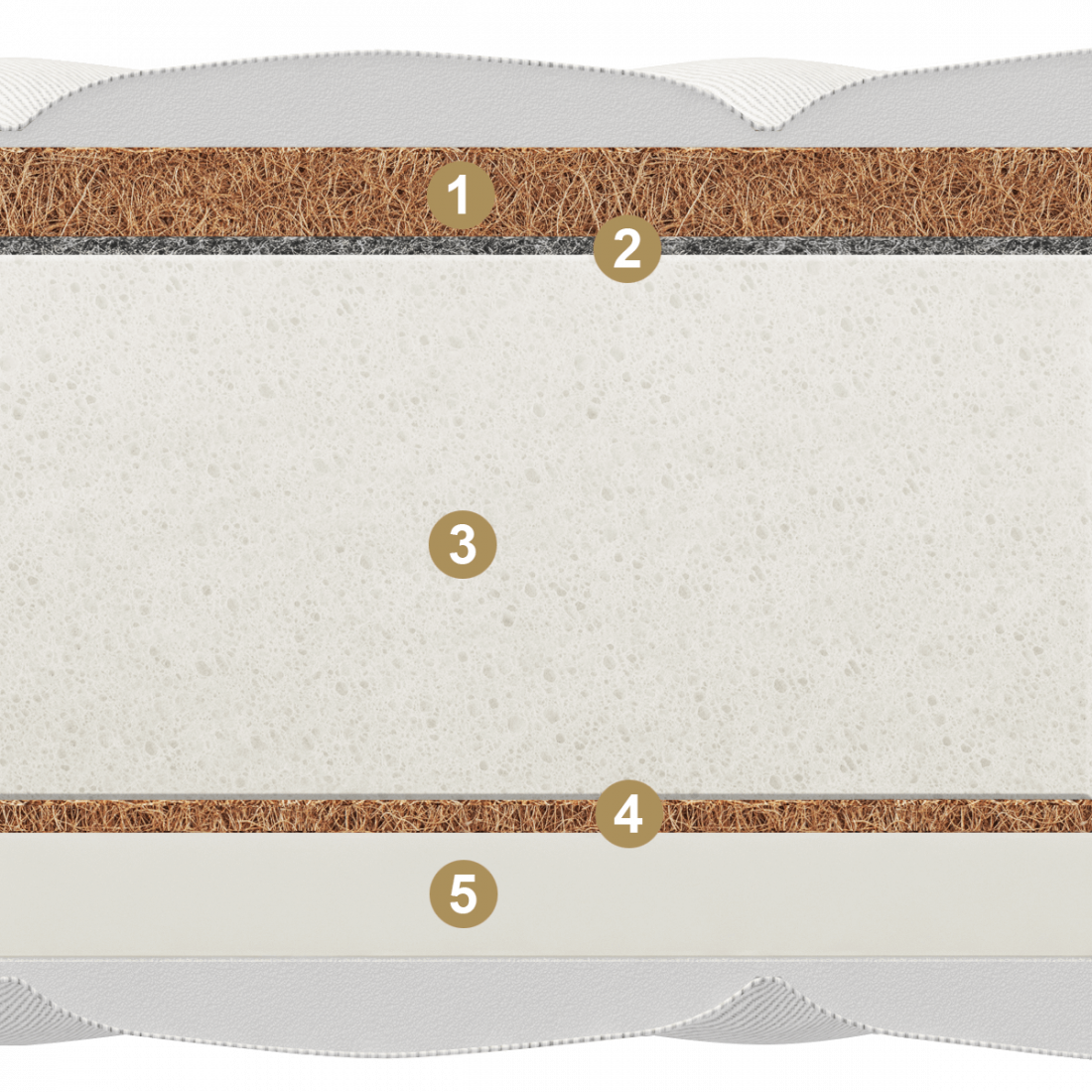Жесткость первой стороны достигается благодаря комбинации 3 см латексированной кокосовой койры и блоку пены natural foam 22-ой плотности (эта плотность характеризуется как наиболее универсальная и эластичная). Она задает особую ортопедическую прочность и упругость данной стороны матраса. Прослойка из 100% натурального термофиксированного фетра гарантирует надёжность и продлевает «жизнь» любого матраса. Средняя жесткость второй стороны достигается благодаря сочетанию пены natural foam (аналога натурального латекса) и 1 см латексированной кокосовой койры.