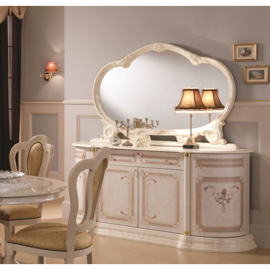 Гостиная Роза (беж) от фабрики ДИА мебель. Вся композиция выполнена в классическом стиле. Бежевый цвет в сочетании с глянцевым покрытием придает этой модели изящность и элегантность. Золотистый орнамент и аккуратные золотистые ручки на фасаде придадут чувства стиля. Мягкие и комфортные стулья помогут вам насладиться прекрасным вечером, после рабочего дня.