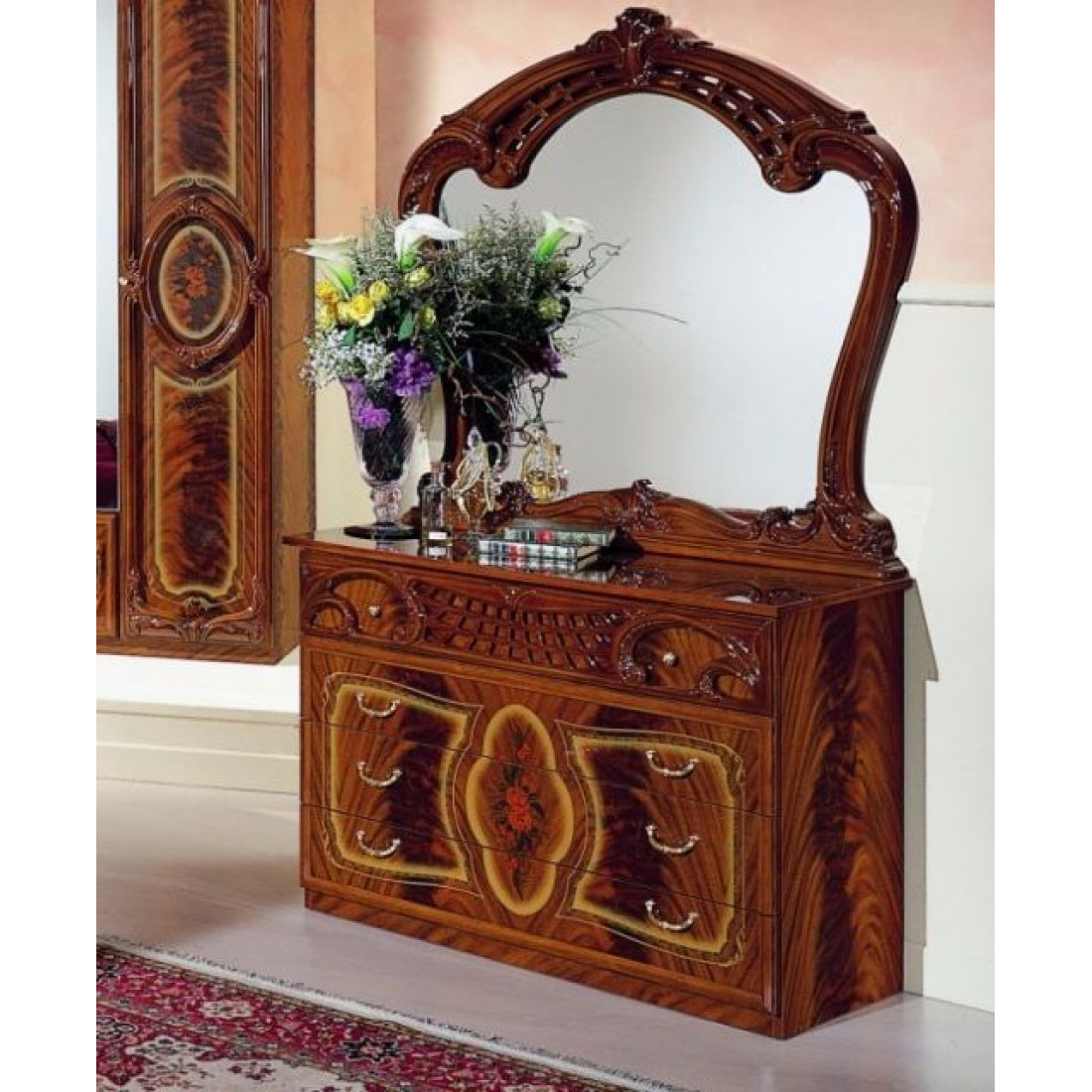 Комод для белья Роза с зеркалом (орех) от Российской фабрики "ДИА мебель". Выполнен в классическом стиле. Ореховый цвет с глянцевым покрытием и орнаментом на фасаде придает этой модели еще больше элегантности. Большая объемная рамка в которую заключено зеркало, придает атмосферу богатства, а зеркало придаст комнате чувства легкости. Такой комод будет незаменимым модулем в вашей спальне.