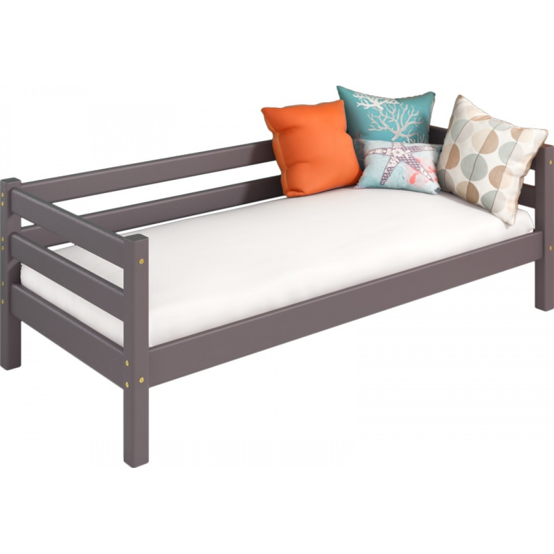 Кровать выполнена из массива дерева, может комплектоваться выкатными ящиками и аксессуарами из текстиля. Отделка выполнена эмалью AqaLAC с добавления красителя цвета "Лаванда".