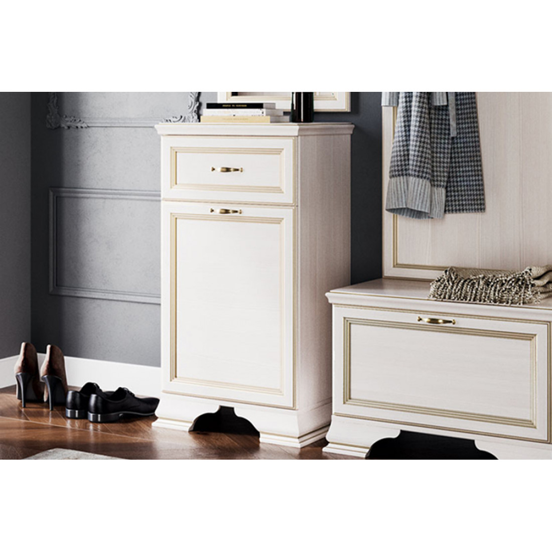 Модульная программа для прихожей «Сиена» производится в текстуре «бодега белый» с эффектом золотого патинирования. Облик «Сиены» дополняют рамочные фасады и карниз в классическом стиле, а также эффектные опоры из МДФ.