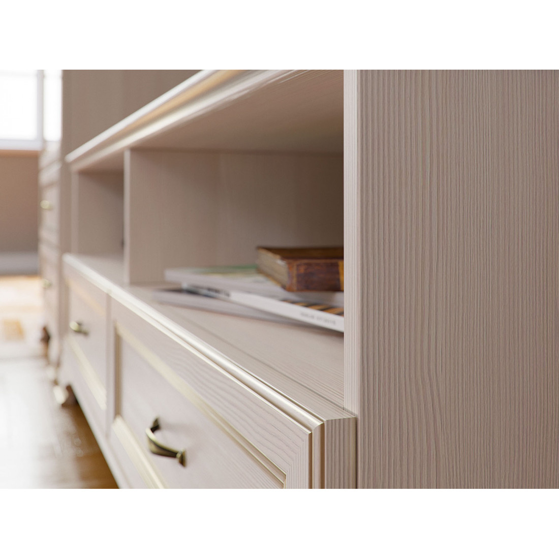 Коллекция производится в текстуре «бодега белый» с эффектом золотого патинирования. Облик «Сиены» дополняют рамочные фасады и карниз в классическом стиле, а также эффектные опоры из МДФ. Мебель комплектуются металлической лицевой фурнитурой премиум-класса в цвете «старая бронза» и надежной крепежной фурнитурой.