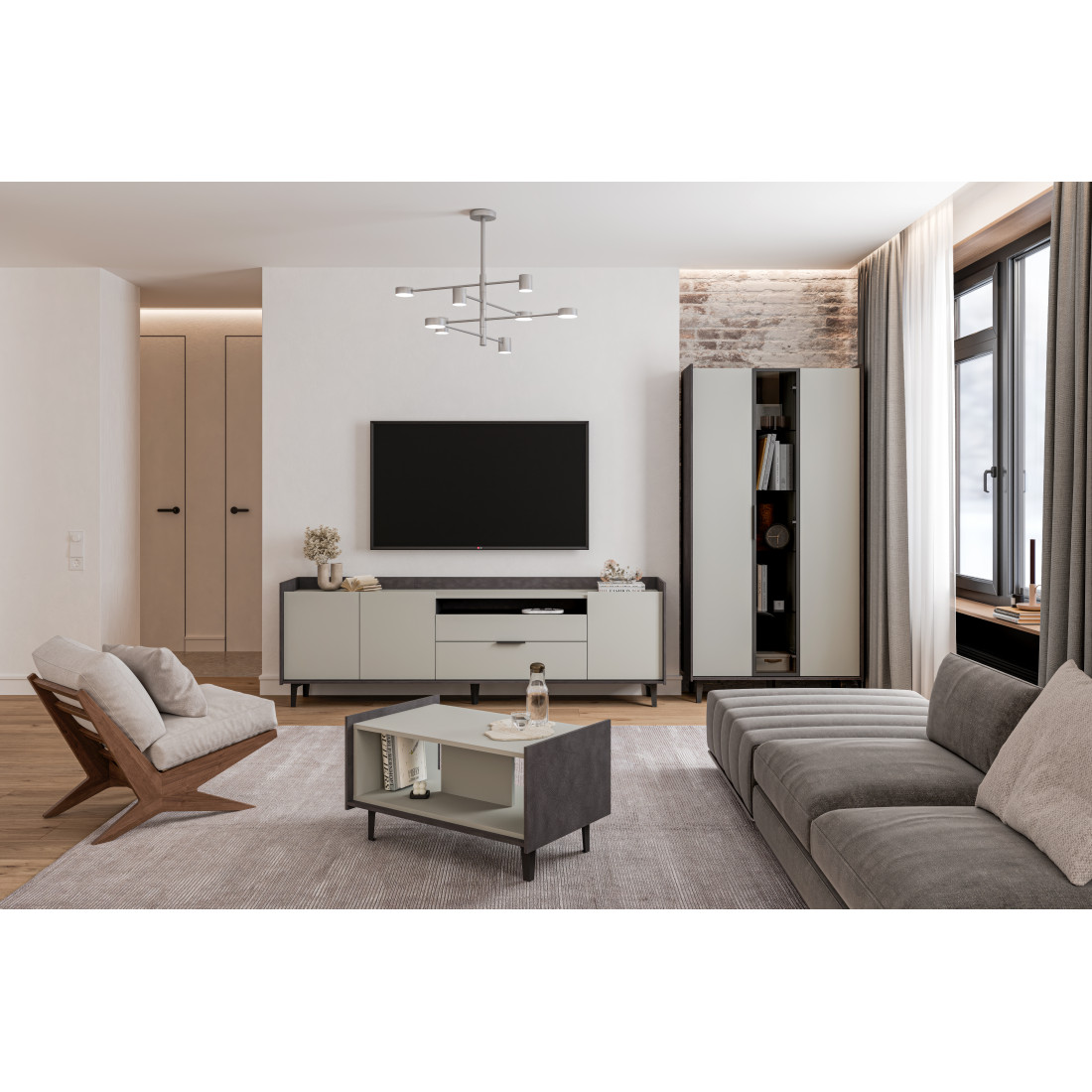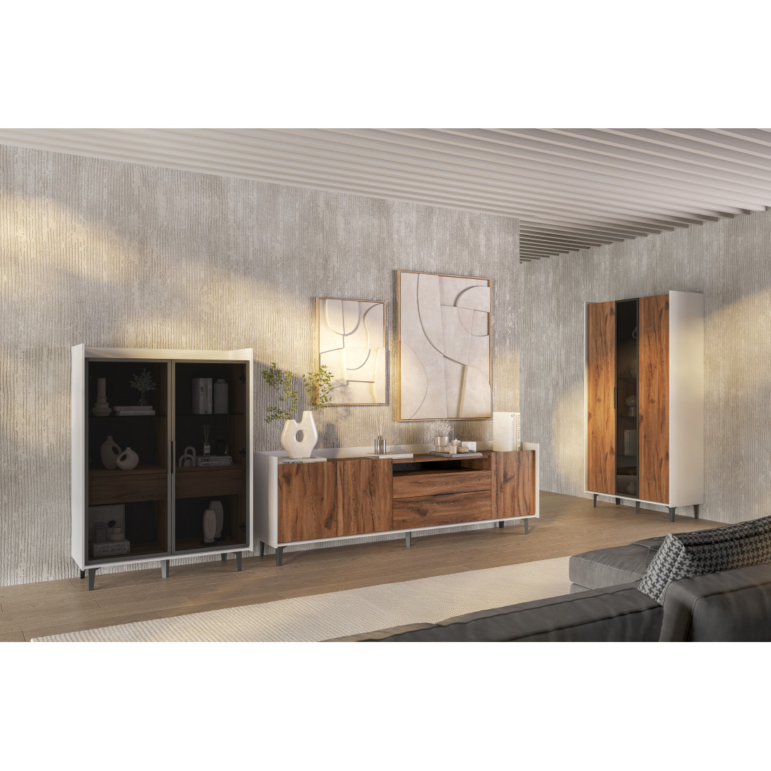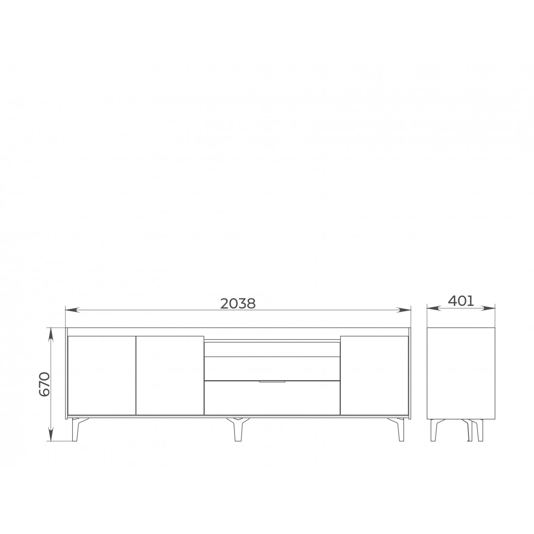 Элегантная тумба под ТВ Модена станет идеальным дополнением для вашей гостиной. Выберите из трех стильных вариантов цветов: Белый-Дуб Элисон, Лунный камень-жемчуг, Металл Бруклин-лунный жемчуг. Ножки из металла обеспечивают устойчивость. Длинная тумба предлагает два отделения с полками для размещения аудио- и видеоаппаратуры, а также одно отделение с двумя удобными ящиками. Над ящиками расположена ниша для мелочей. Эта тумба сочетает в себе функциональность и стиль, делая ее идеальным решением для вашего медиацентра в гостиной